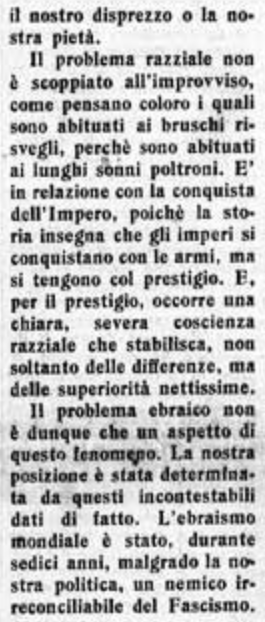 Il 19 settembre 1938 vengono emanate le leggi razziali, di seguito un estratto da Il Telegrafo