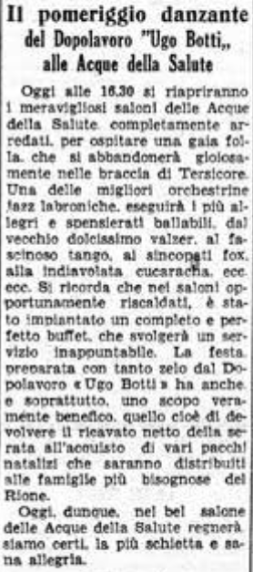 Si svolgevano inoltre molti eventi, come si evince da questo articolo datato 28 novembre 1937 pubblicato su Il Telegrafo.
